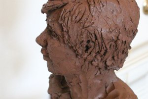 Portrait sculpture of Aston resting his chin on his hand