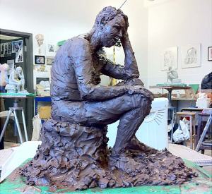 Portrait sculpture of Aston resting his chin on his hand