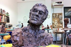 Portrait sculpture of Aston resting his chin on his hand