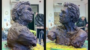 Portrait sculpture of Aston resting his chin on his hand