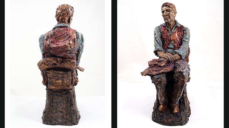 Portrait sculpture of Aston resting his chin on his hand