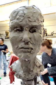 Portrait sculpture of Aston resting his chin on his hand