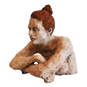 Portrait sculpture of Aston resting his chin on his hand