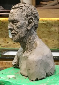 Portrait sculpture of Aston resting his chin on his hand